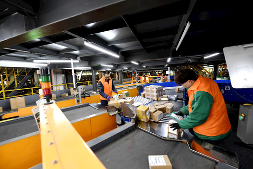 濟(jì)南中心局員工在第二套雙層包裹自動(dòng)分揀機(jī)前調(diào)整包裹二維碼。