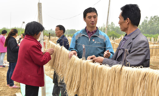 江蘇省豐縣郵政分公司王溝鎮(zhèn)鄉(xiāng)郵員趙本增熱心幫助當(dāng)?shù)匕傩彰撠氈赂?。圖為10月12日,趙本增途經(jīng)粉條晾曬基地,主動(dòng)提議用自己的“農(nóng)民致富微信朋友圈”發(fā)信息幫經(jīng)營(yíng)業(yè)主賣粉條。 □卜慶海 劉立明 攝影報(bào)道