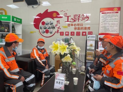 在郵政大廳里,“工驛站”整潔有序,幾位環(huán)衛(wèi)工人正在休息,沙發(fā)、飲用水、圖書、充電器、急救箱、熱飯用的微波爐一應(yīng)俱全。環(huán)衛(wèi)工人孫師傅說,他們每天自己帶飯,冬天只能吃冷饅頭,現(xiàn)在有了“工驛站”,終于能吃上熱飯菜了??爝f員李波說,以后再也不用為手機(jī)沒電發(fā)愁了,找最近的“工驛站”充電,方便極了。