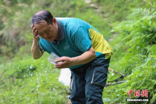 4月12日,行走在山林間,張林昌用山泉洗臉。 中新社發(fā) 瞿宏倫 攝