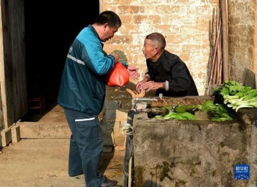 10月28日,在太湖縣北中鎮(zhèn)桐山村,吳義陽(yáng)將代購(gòu)的糯米送到老人手中。