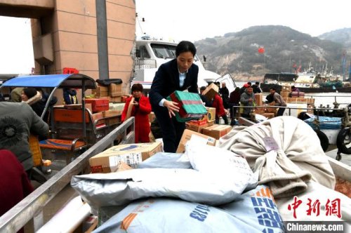 船一到,在碼頭等待已久的蔣玉美就熟練地從隨船貨物中,挑選出屬于郵政公司的郵件和包裹?!敖裉煊?00多件,大多是村民網(wǎng)購的生活用品?!笔Y玉美稱,每天一班的客船在中午到達,她就會到碼頭接收,分揀后進行投遞。