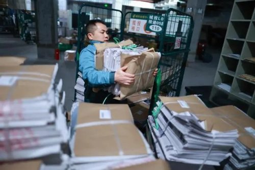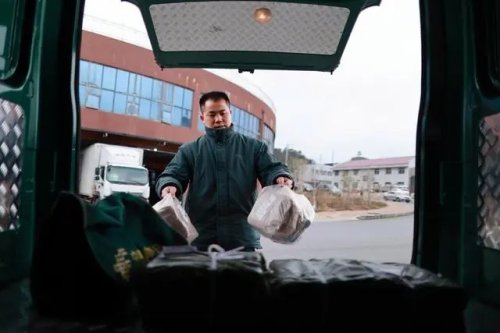 在貴州省龍里縣草原路郵政郵件處理中心外,莫富元將當(dāng)天需要投遞的物品拿上小貨車(2月14日攝)。