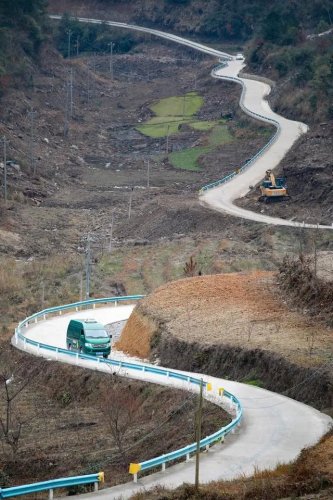 莫富元駕駛小貨車在通往龍里縣平西村的山間道路上行駛(2月14日攝)。