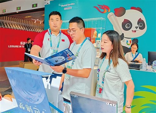 郵政工作人員向運(yùn)動(dòng)員細(xì)致介紹大運(yùn)會文化產(chǎn)品。