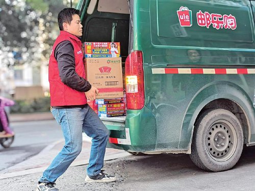 浙江省紹興市郵政分公司專職地推人員孫明在配送“年貨節(jié)”產(chǎn)品。 □鄭思薇 攝