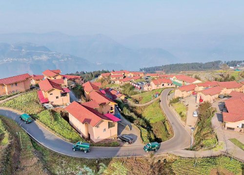 郵車駛?cè)脲e落有致的“彝家新寨”?!踅昃啊z