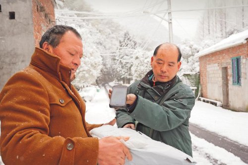 “哇,好大的雪呀!”1月22日晨,浙江省金華市的百姓為眼前的雪白一片所震驚,“十多年了,都沒見到過這么大的雪了!”整個(gè)金華市城鄉(xiāng)都蓋上一件厚厚的“雪衣”。通往婺城區(qū)安地鎮(zhèn)山村的公路已經(jīng)被交警攔住,普通車輛禁止上山。此時(shí),只有一抹“綠色”在一步一步走進(jìn)山村。這是金華市郵政分公司安地投遞班的郵遞員在給村民送去郵件。