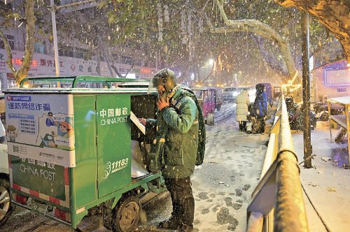 1月31日晚,周口地區(qū)大雪紛飛,道路結(jié)冰、路面濕滑,給交通造成了影響,也給郵政投遞工作帶來了挑戰(zhàn)。周口市郵政分公司早部署、細謀劃,認真落實雨雪天氣應(yīng)急預(yù)案,在確保員工和車輛安全的情況下,全力保障郵件準時送達。各網(wǎng)點投遞員牢記職責,堅守崗位,迎著風(fēng)雪穿梭在大街小巷,確?!暗郊嘏?,派件必達”。
