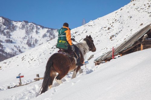 暴雪后的禾木鄉(xiāng)行路艱難。為將郵件及時送到半山腰處的養(yǎng)蜂戶家中,鄉(xiāng)郵員在進入山區(qū)后騎馬投送郵件?!醢怖ァz