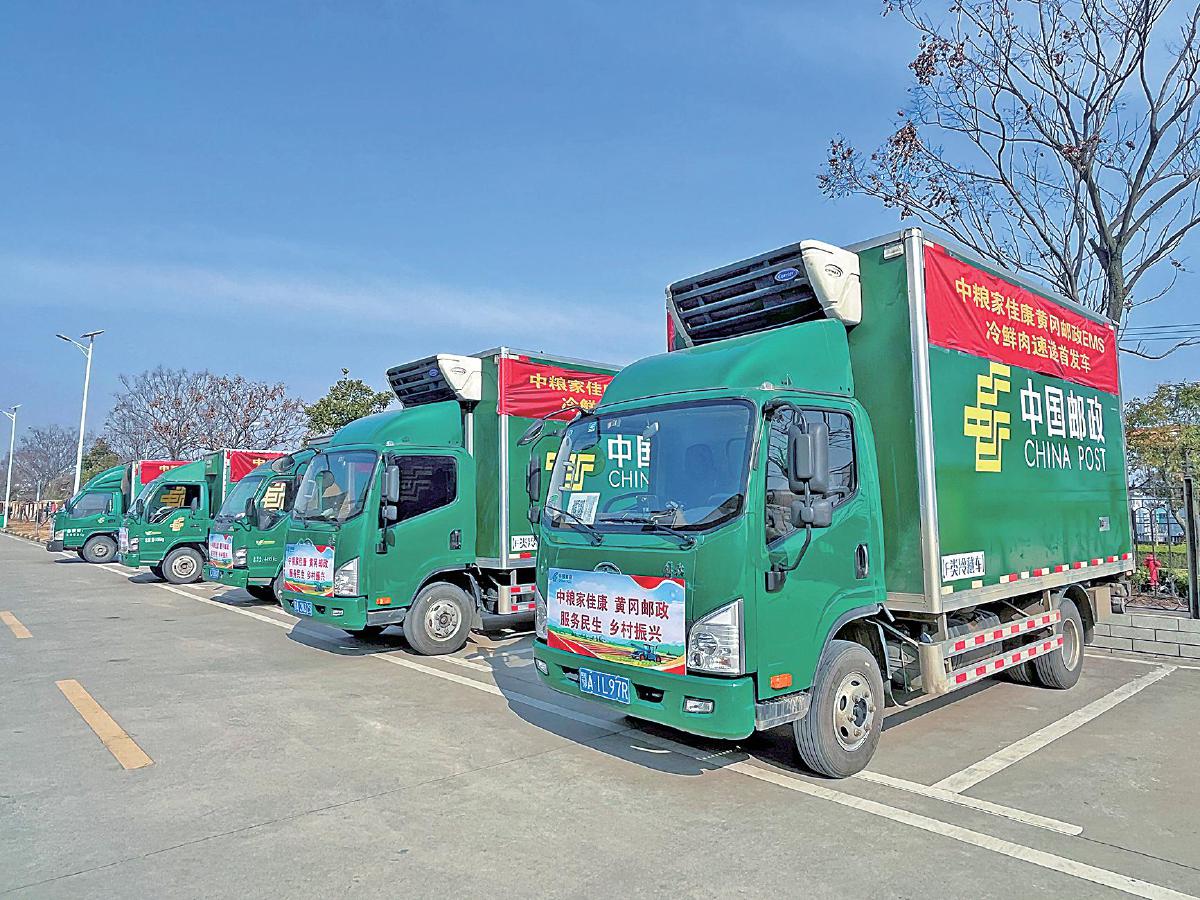在黃岡市黃州區(qū)的中糧家佳康(湖北)有限公司園區(qū),帶有郵政標(biāo)識(shí)的冷藏車依次排開。