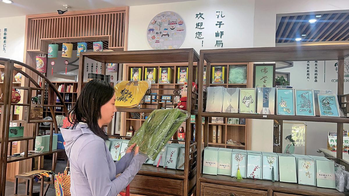 游客在孔子郵局內(nèi)選購(gòu)文創(chuàng)產(chǎn)品。