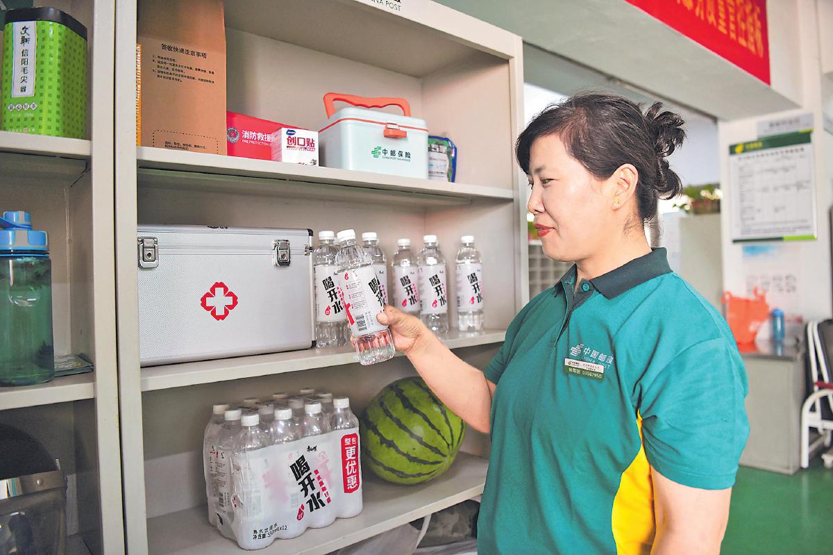 6月以來(lái),河南省氣象臺(tái)連續(xù)發(fā)布多個(gè)高溫紅色預(yù)警。為應(yīng)對(duì)極端高溫天氣、保障企業(yè)安全穩(wěn)定運(yùn)行,河南省郵政分公司要求所轄各級(jí)郵政企業(yè)加強(qiáng)對(duì)員工的關(guān)心關(guān)愛(ài),做好一線生產(chǎn)人員的健康監(jiān)測(cè),尤其是對(duì)攬投、分揀等一線生產(chǎn)人員,適當(dāng)調(diào)整作業(yè)時(shí)間,備齊防暑藥品及防暑飲品,聯(lián)合工會(huì)積極開(kāi)展“夏日送清涼”等慰問(wèn)活動(dòng),確保員工身體健康與生產(chǎn)安全。圖為鄭州市鄭東新區(qū)郵政分公司常寨攬投部為攬投員配備了防暑物品和藥品等。