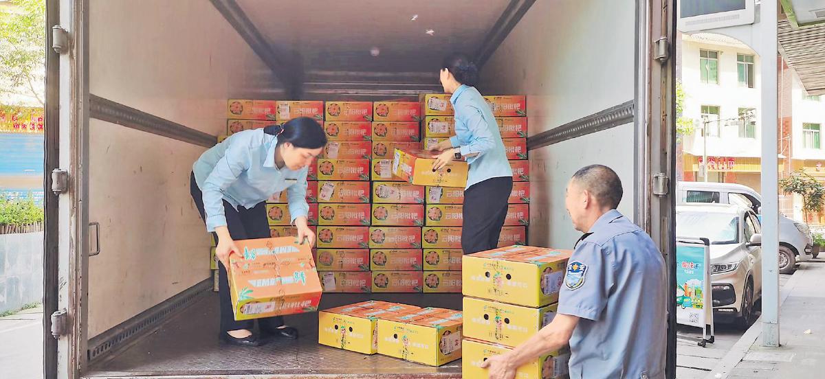 收寄高峰期,巴陽郵政所全員出動,把裝好箱的枇杷郵件搬上郵車。□譚鵬程 攝
