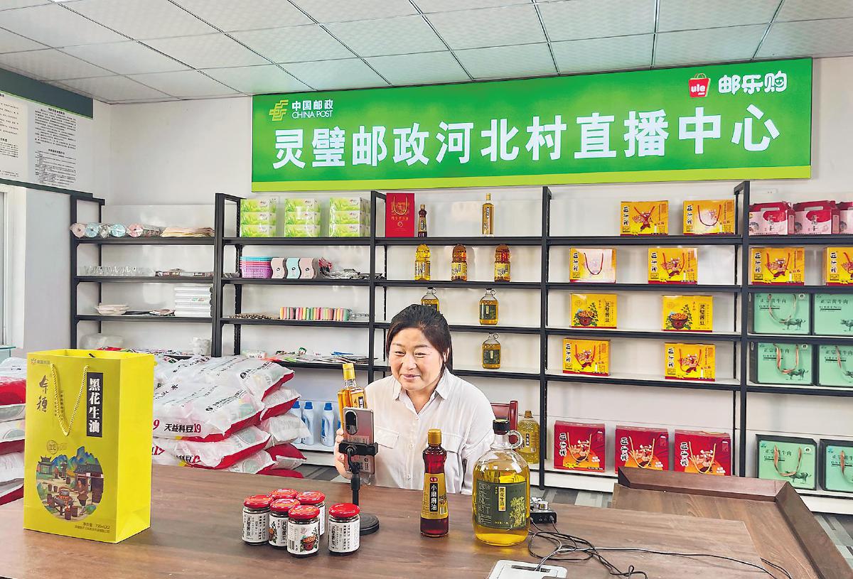 張亳玲在郵政直播間為本村特色農(nóng)產(chǎn)品直播帶貨。 □許浩然 攝