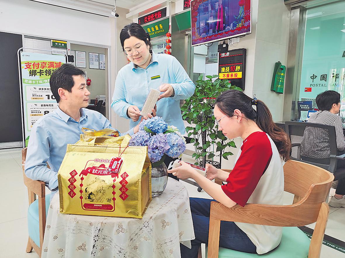 郵政工作人員在網(wǎng)點向客戶推介“狀元米”祈福禮盒?!蹶愪J 攝