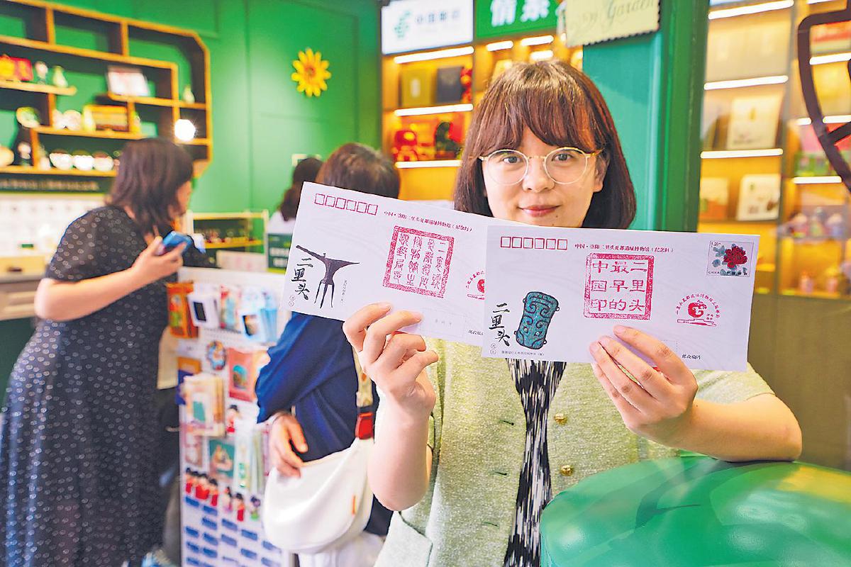 “爸爸,快看!這個印章像不像電視里的玉璽?”來自鄭州的小朋友徐鳴鶴興高采烈地向家長炫耀自己的發(fā)現(xiàn)。他口中的“玉璽”是二里頭文化主題郵局結(jié)合夏王朝元素推出的紀念印章,其中一枚印章專門以小篆字體刻制,趣味十足又震撼人心。據(jù)主題郵局負責人代向梅介紹,主題郵局還有紀念印章、文物系列印章、洛陽特色景點印章、套色印章等。一到假期,就有大量游客排隊蓋章。河南科技大學學生小夏邊蓋章,邊向同伴“抱怨”說:“自從二里頭主題郵局的集戳筆記在網(wǎng)上火了后,總有外地的朋友托我為他們集戳。沒辦法,我只能一次次享受蓋戳的樂趣了!”