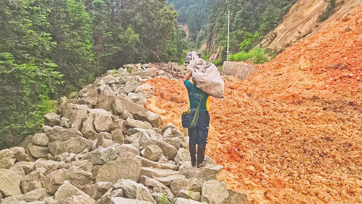 廣西壯族自治區(qū)柳州市融水苗族自治縣因洪水突發(fā)山體滑坡,融水縣郵政分公司工作人員徒步走過滑坡區(qū),為黨鳩村村民投遞包裹?!觞S建勛 攝