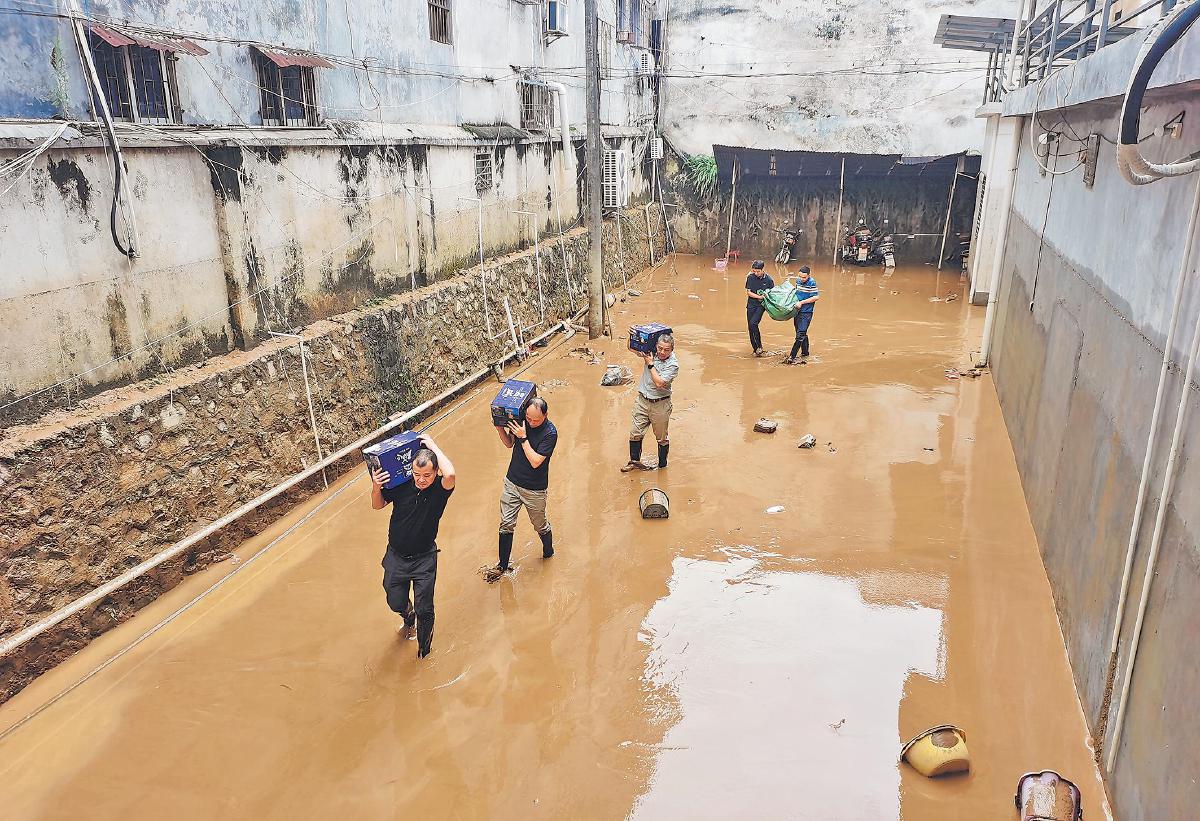 在廣東省梅州市,郵政員工在確保自身安全的前提下積極組織轉(zhuǎn)移郵件、文件和重要物資?!蹒娖计肌z