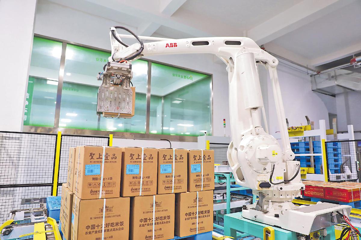 聽說郵儲銀行的人前來調(diào)研,本來臨時要出差的五常市金禾米業(yè)有限責(zé)任公司董事長李云輝將出行時間硬是推遲1小時,只為能見上一面。當(dāng)看到金禾米業(yè)生產(chǎn)線上兩臺“ABB”數(shù)控機(jī)器臂正在精準(zhǔn)分揀包裝好的盒裝高端稻米產(chǎn)品時,記者不禁感嘆:“普通的大米居然能做得如此高科技!”