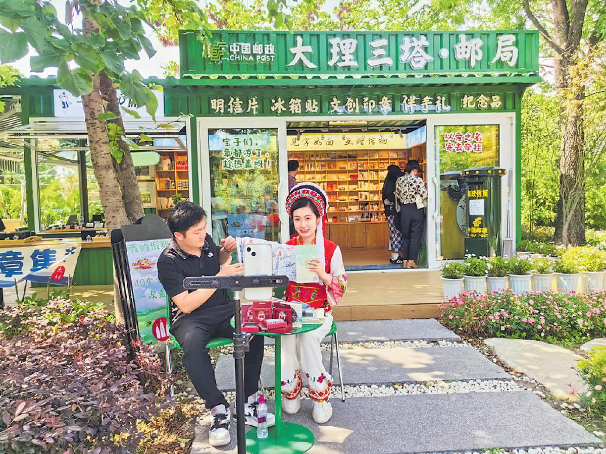 “我在網(wǎng)上刷到三塔主題郵局,所以來這里蓋印章。順著印章順序打卡游覽三塔,是我此次旅途中必須完成的一個項目?!笔罴倨陂g,來自安徽的游客王女士期待地說。近兩個月來,大理三塔主題郵局迎來旺季人流高峰,平均每天客流量超8000人,主題郵局內(nèi)的文創(chuàng)產(chǎn)品也受到游客的追捧。