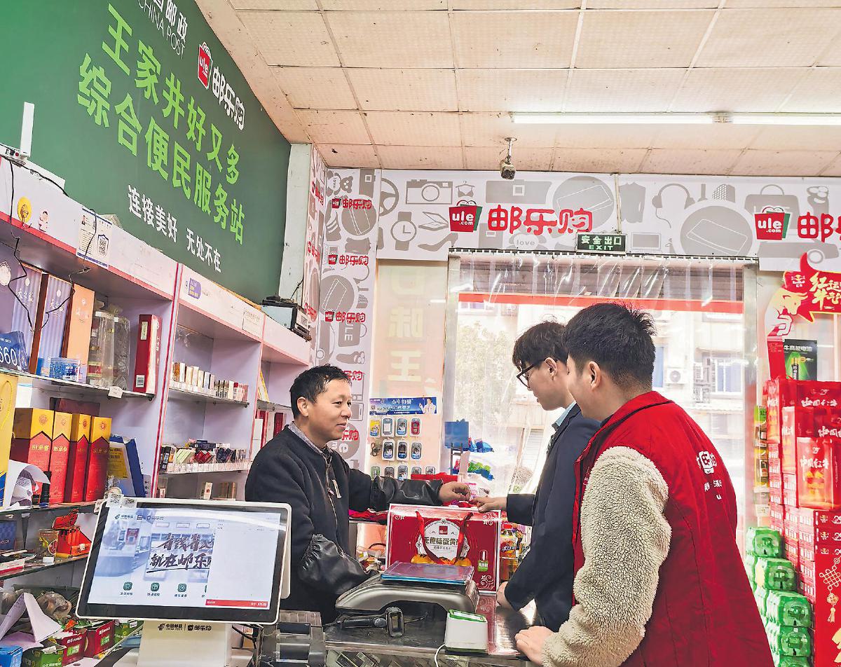 諸暨郵政網(wǎng)點管理人員在王家井好又多綜合便民服務(wù)站巡店,并與掌柜交流業(yè)務(wù)開展情況。