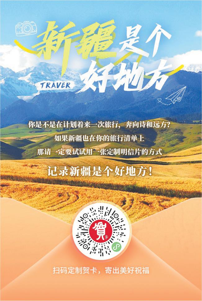 當(dāng)指尖輕點(diǎn),祝福帶著天山的清風(fēng)、大漠的遼闊、湖泊的清澈飛向遠(yuǎn)方時(shí),一份對(duì)新疆的向往也隨之悄然生根。這枚方寸之間的賀卡,承載著郵政服務(wù)民生的溫度,更鏈接著新疆文旅產(chǎn)業(yè)無(wú)限可能的璀璨未來(lái)——每一次分享,都是新疆走向世界的腳步;每一次心動(dòng),都是文旅繁榮的嶄新起點(diǎn)。