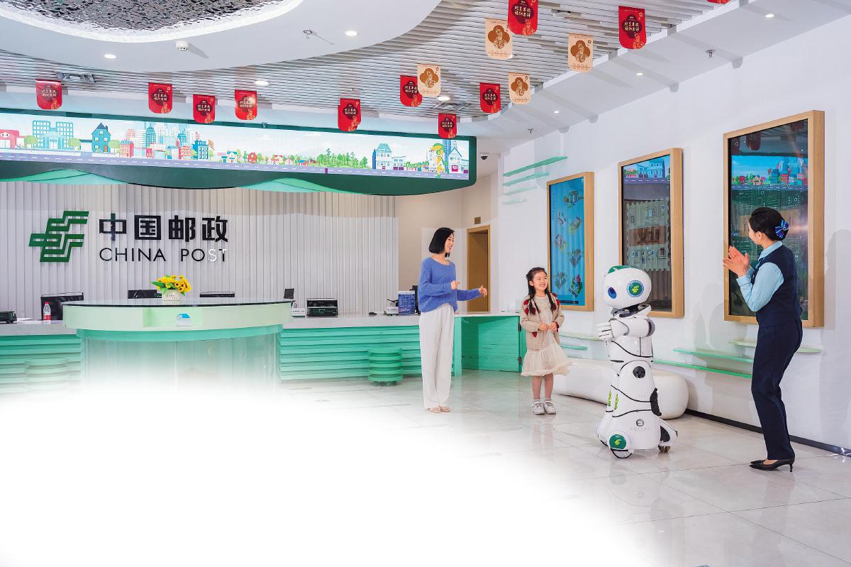 在山東省濟(jì)南市趵突泉郵政支局,圓潤(rùn)可愛(ài)的智能機(jī)器人“小郵”正與小朋友共舞。