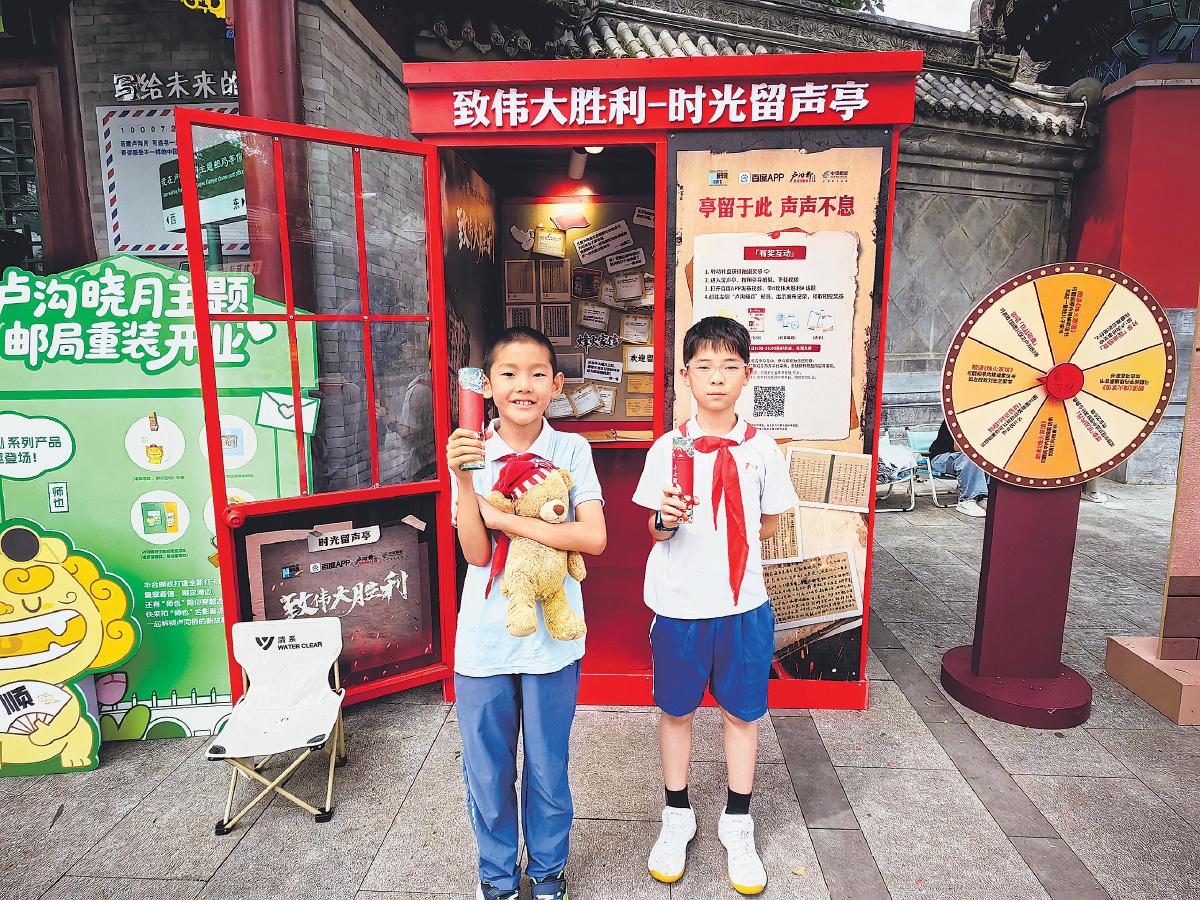 8月15日,“致敬偉大勝利”及烽火家信系列活動在北京市豐臺區(qū)宛平城啟動。該活動由百度App聯(lián)合新華網(wǎng)、軍事博物館、退役軍人事務部、北京市郵政分公司、盧溝橋文化公園等單位共同舉辦。游客在“致偉大勝利”時光留聲亭旁,轉(zhuǎn)動轉(zhuǎn)盤即可選擇錄制內(nèi)容,包括參觀抗戰(zhàn)展陳的體會、朗讀一封感人的抗戰(zhàn)家書或唱一首經(jīng)典革命歌曲,產(chǎn)生的優(yōu)質(zhì)視頻素材將由權(quán)威媒體整理后發(fā)布。參加“時光留聲”錄制的游客還可到旁邊的盧溝曉月主題郵局領(lǐng)取抗戰(zhàn)家書主題明信片,加蓋專屬紀念戳或購買其他文創(chuàng)產(chǎn)品。