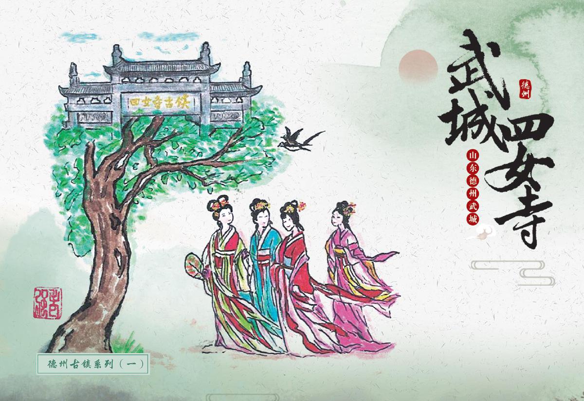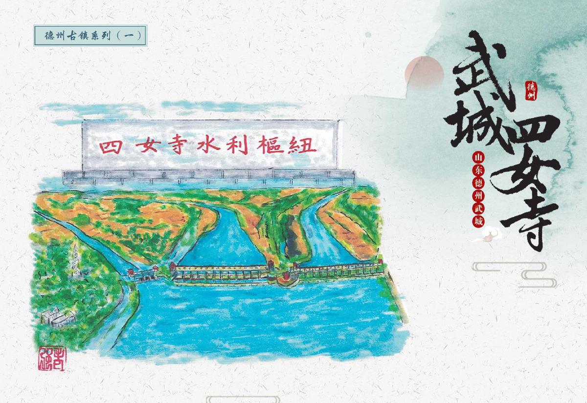 此次首發(fā)的文創(chuàng)產(chǎn)品涵蓋郵資封、明信片、郵資機(jī)宣傳戳及主題宣傳戳四大類,每一件都浸潤(rùn)著四女寺的文化基因。其中,“四女”郵資封(右上圖)以工筆重彩呈現(xiàn)經(jīng)典場(chǎng)景:畫(huà)面中四位女子于槐樹(shù)下漫步,旁側(cè)牌坊古樸,飛鳥(niǎo)點(diǎn)綴天際,還原“四女侍親,栽槐立誓”的民間傳說(shuō),四女常伴樹(shù)側(cè),行孝事、話桑麻,樹(shù)與人相襯成景,演繹著傳統(tǒng)孝道的溫度,讓古老美德在時(shí)光里熠熠生輝,供后人感懷、傳揚(yáng);而“四女寺水利樞紐”明信片(右下圖)則通過(guò)航拍視角與細(xì)節(jié)特寫(xiě)的結(jié)合,展現(xiàn)這座黃河下游重要水利工程的宏偉氣勢(shì)——堤壩蜿蜒如巨龍伏波,閘門(mén)啟閉間盡顯古人治水的智慧結(jié)晶,讓現(xiàn)代觀者得以觸摸歷史的溫度。