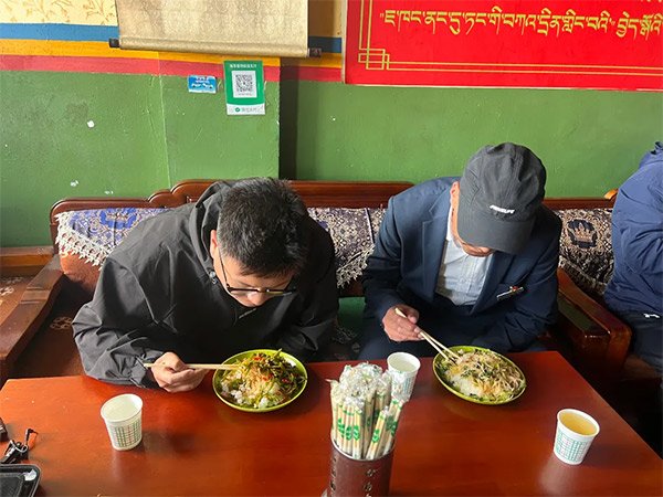 午飯時(shí)間,鄉(xiāng)政府旁的索多藏餐館里擠滿(mǎn)了來(lái)用餐的人。有觀光的游客,有像我們一樣到這里工作的外鄉(xiāng)人,還有本地的老百姓。記者和曲巴一起回憶起10年前在普瑪江塘只能吃面包、泡面的采訪經(jīng)歷。曲巴說(shuō):“現(xiàn)在鄉(xiāng)上開(kāi)了3家餐館,大家也能吃上熱乎乎的飯菜了?!庇浾唿c(diǎn)了一份青椒肉絲蓋飯,曲巴要了一份小白菜蓋飯。我們吃得一干二凈!