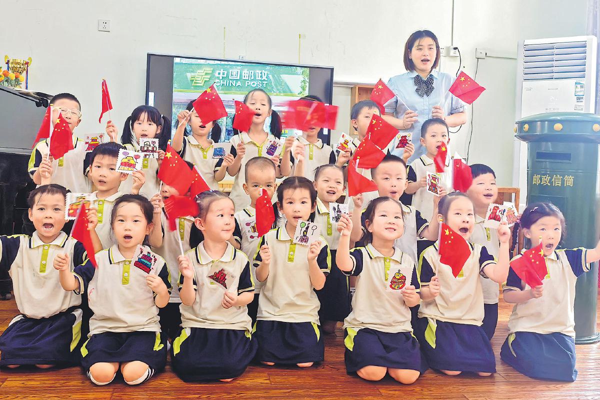 “十一”國慶節(jié)即將到來之際,為將愛國主義的種子深植心田,讓民族自豪感蓬勃生長,江蘇省南通市海門區(qū)郵政分公司聯(lián)合該區(qū)通源幼兒園開展“郵趣慶華誕”主題活動,通過辨識郵政業(yè)務、學做郵帽、手繪郵票和明信片等形式,讓孩子們體驗豐富多彩的郵政文化,共同迎接中華人民共和國成立76周年。圖為該幼兒園小朋友手舉國旗和手繪的郵票圖案,齊聲祝福偉大祖國生日快樂。